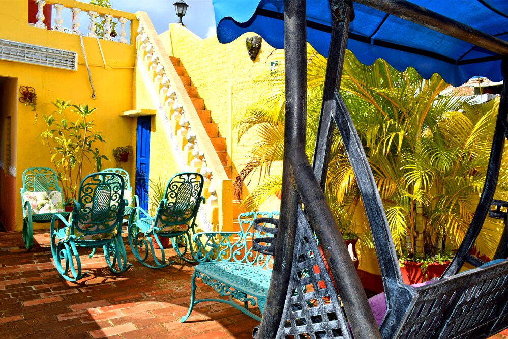 Your family will have everything in this downtown lodging. It features 5 independent rooms with private bathrooms, well-appointed with 24/7 renewable energy. It's close to local points of interest and entertainment. Enjoy authentic Creole cuisine for breakfast, cocktails, and dinner, plus tours, taxi service, bikes, etc. From our raised terrace, admire the surrounding mountain range. #ViñalesCuba #24hEnergy