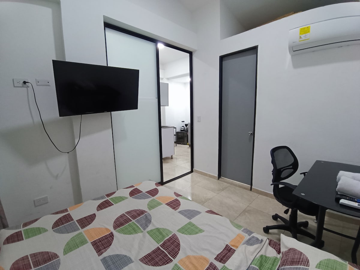 Disfruta de la sencillez de este alojamiento tranquilo y céntrico. Aparta estudio costa de 2 habitaciones en una hay sofá cama y en la otra una cama de 1.60 un solo aire el cual es compartido para las dos habitaciones, un ventilador un baño, tiene su entrada independiente. Está habilitado para 4 personas. - No tiene cocina.