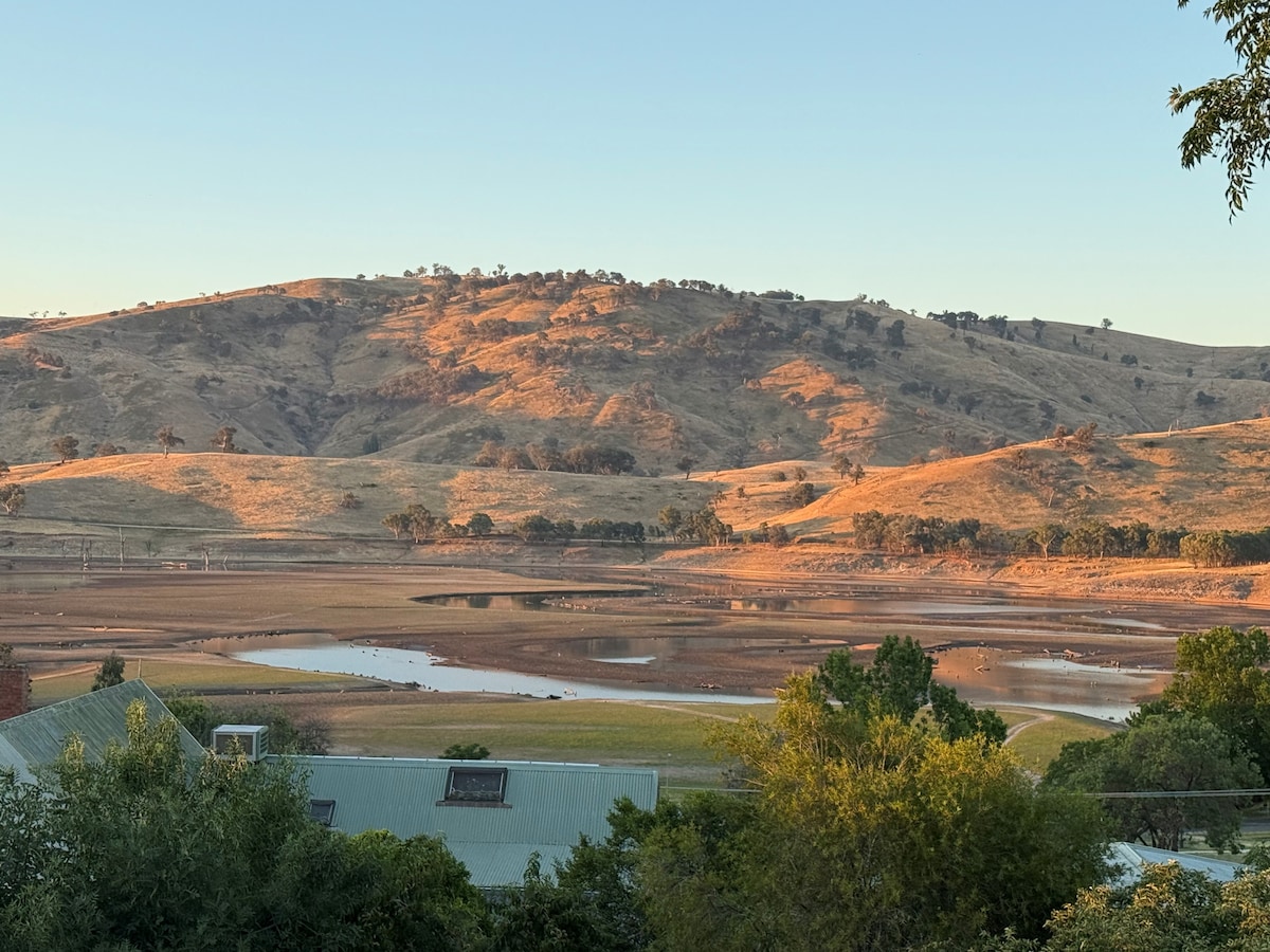 Take a break & unwind at this lovely house with sensational views. The entire house is yours to enjoy with lounge room, kitchen, dining room, bathroom, pantry, laundry, additional toilet, garage converted to games room & 2 decks to enjoy the magnificent views. Relax and enjoy the panoramic view; sip on a beverage, read a book and chill. High speed WiFi for work or pleasure. 2 minute walk to Lake Hume and 5 minute walk to Town Centre.