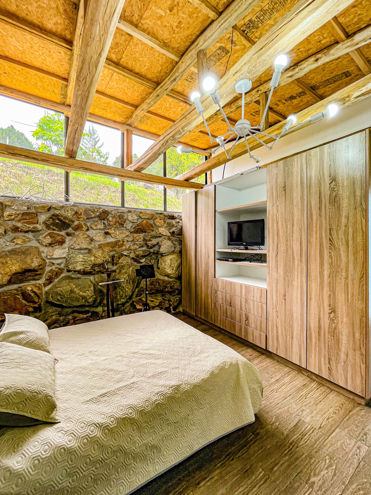 Disfruta del encantador entorno de este romántico lugar en la naturaleza mientras tienes unas vista exclusiva de la ciudad Dispone de cocina completa, refrigerador y una sala de estar cómoda. 1 cama - 1 sofá cama - 2 sillones de cuero tipo cama en la sala. Es un entorno tranquilo rodeado de árboles, estamos cerca del zoo, por lo que podrás escuchas a los animales si eres afortunado, podrías escuchar incluso leones! Tenemos delivery de confianza, el número está en un cartel interno de suite.