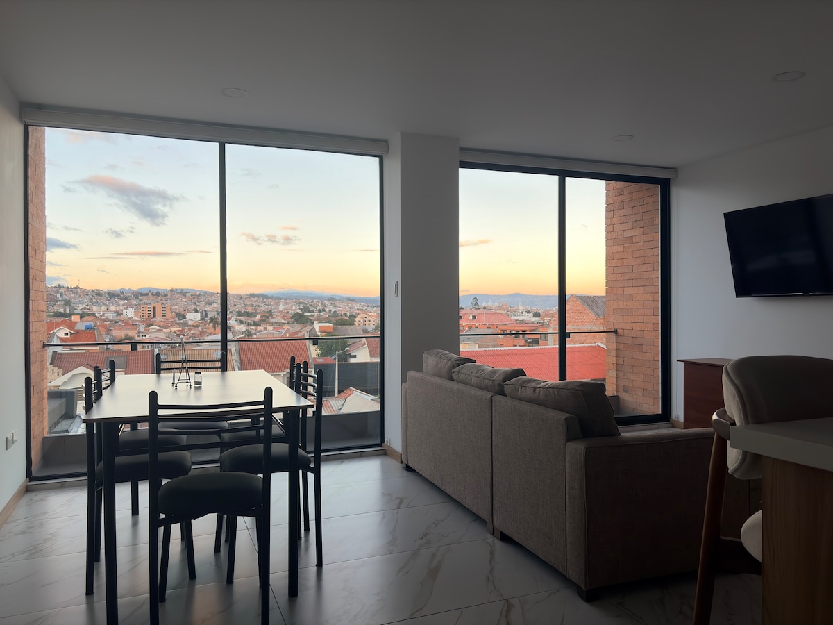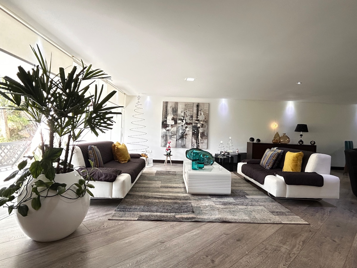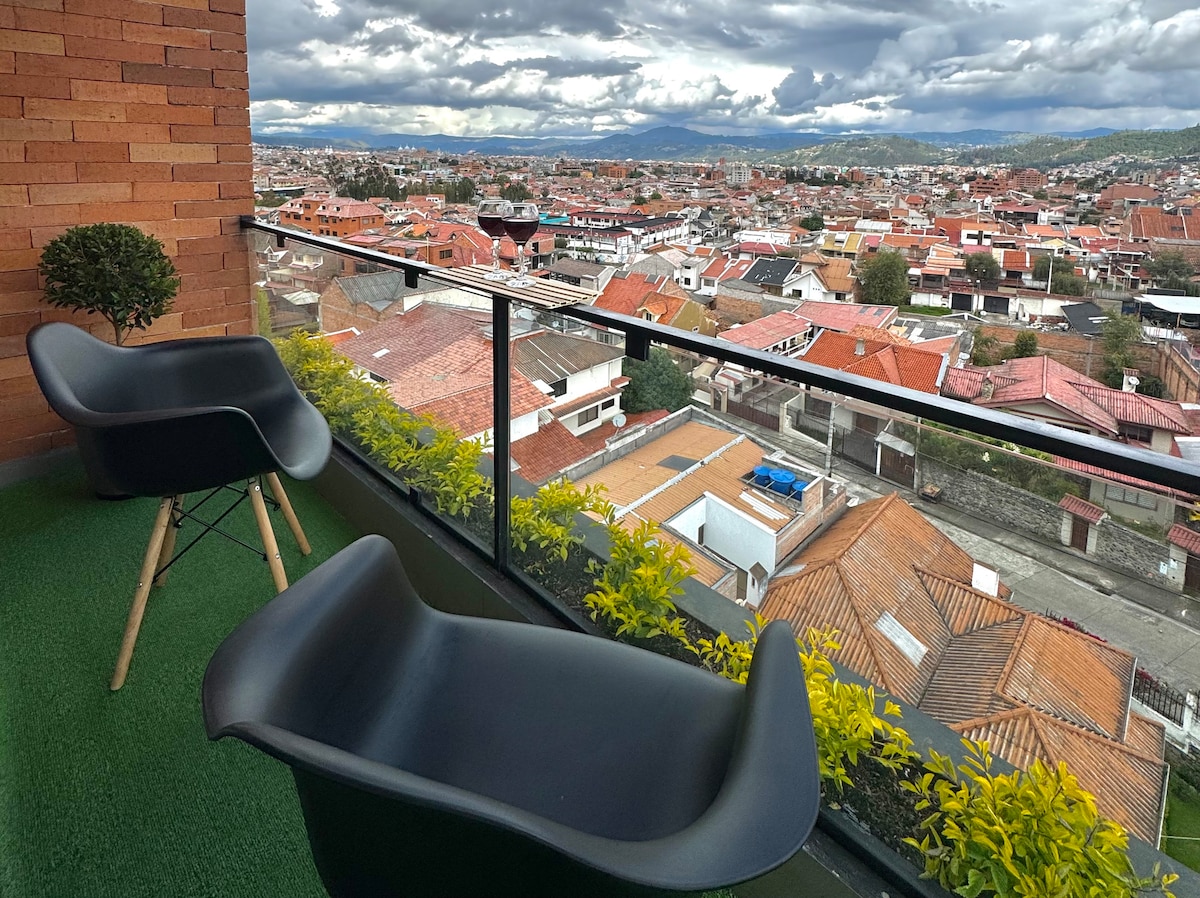 Spacious, modern and bright apartment 7 minutes from the central park and the cathedral. Located in the most desirable neighborhood in the city, this Pent-house is a fabulous and serene oasis in the center of Cuenca. It has a large bedroom with full bathroom, bright living room, toilet, laundry, equipped kitchen, private terrace and gym. An area of 1500 ft² distributed over 2 floors for greater guest comfort. Location, comfort and services make this place the best option in Cuenca.