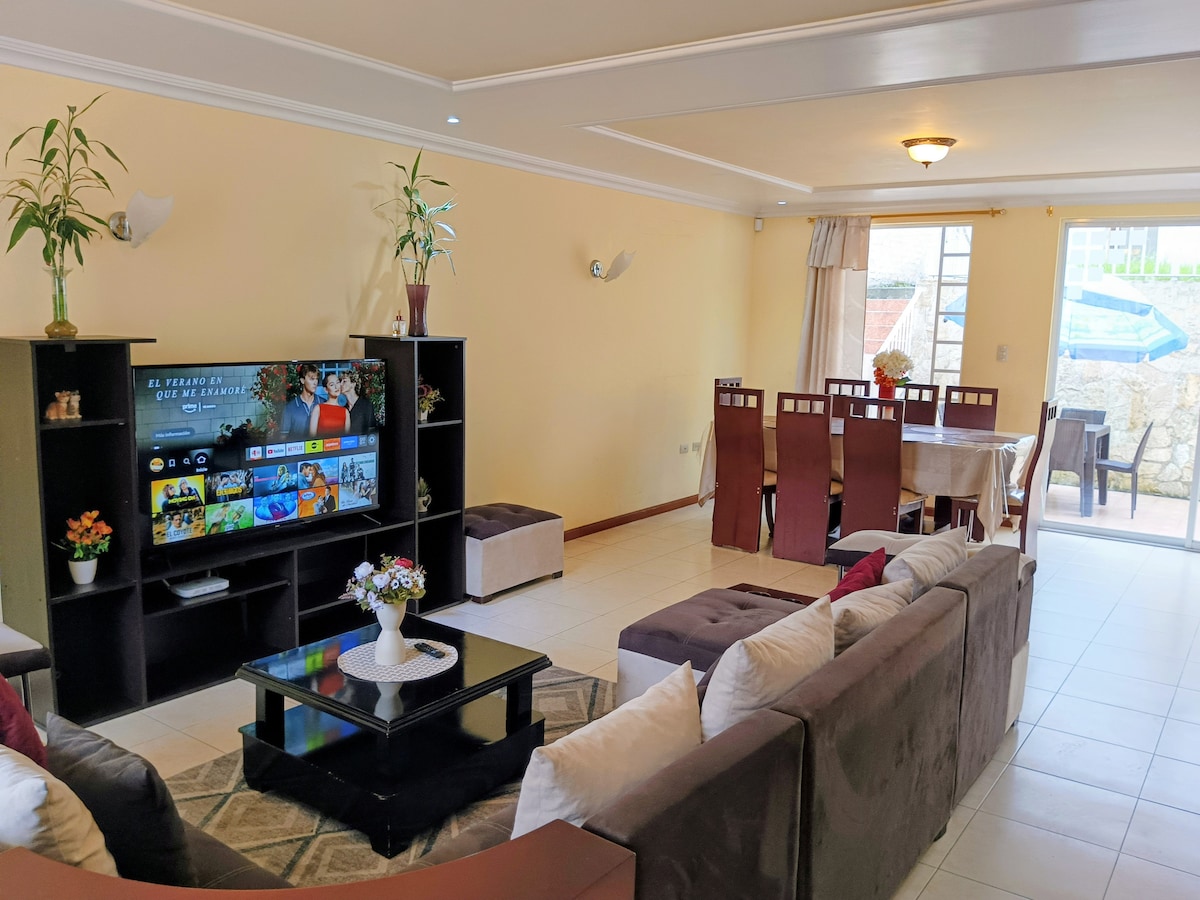 Lleva a toda la familia a este fantástico lugar con muchas zonas para divertirse. La casa consiste de 6 dormitorios con 14 camas +4 colchónes, 3.5 baños, 6 Smart TVs, cocina completa, zona barbacoa, espacio verde con trampolín y columpios para niños. Mesa de billar y futbolín, terraza con una vista hermosa a la ciudad. WiFi, parqueadero para 3 carros. Barrio tranquilo, a dos cuadras de tiendas, restaurantes, farmacias, buses y taxis. Esta a 15 minutos del centro histórico de Cuenca