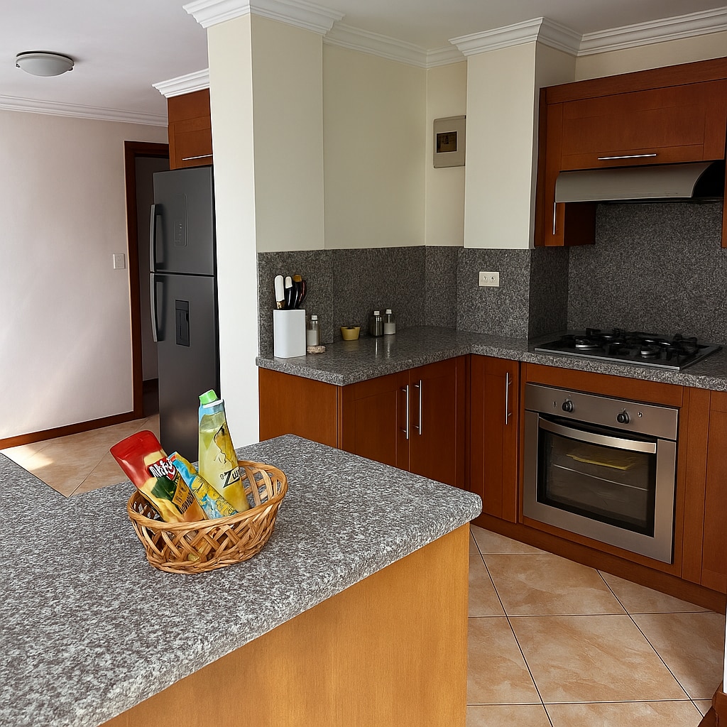 Modern and cozy suite in Puertas del Sol, one of Cuenca’s most exclusive and safest neighborhoods. Located in a private building just steps from restaurants, cafés, supermarkets, pharmacies, shopping centers, and the charming Tomebamba River with its riverside park. Excellent access to public transportation, the Historic Center, and tourist areas of the city. Fast WiFi, fully equipped kitchen, streaming TV. Perfect to relax, explore, and enjoy a safe, comfortable stay.