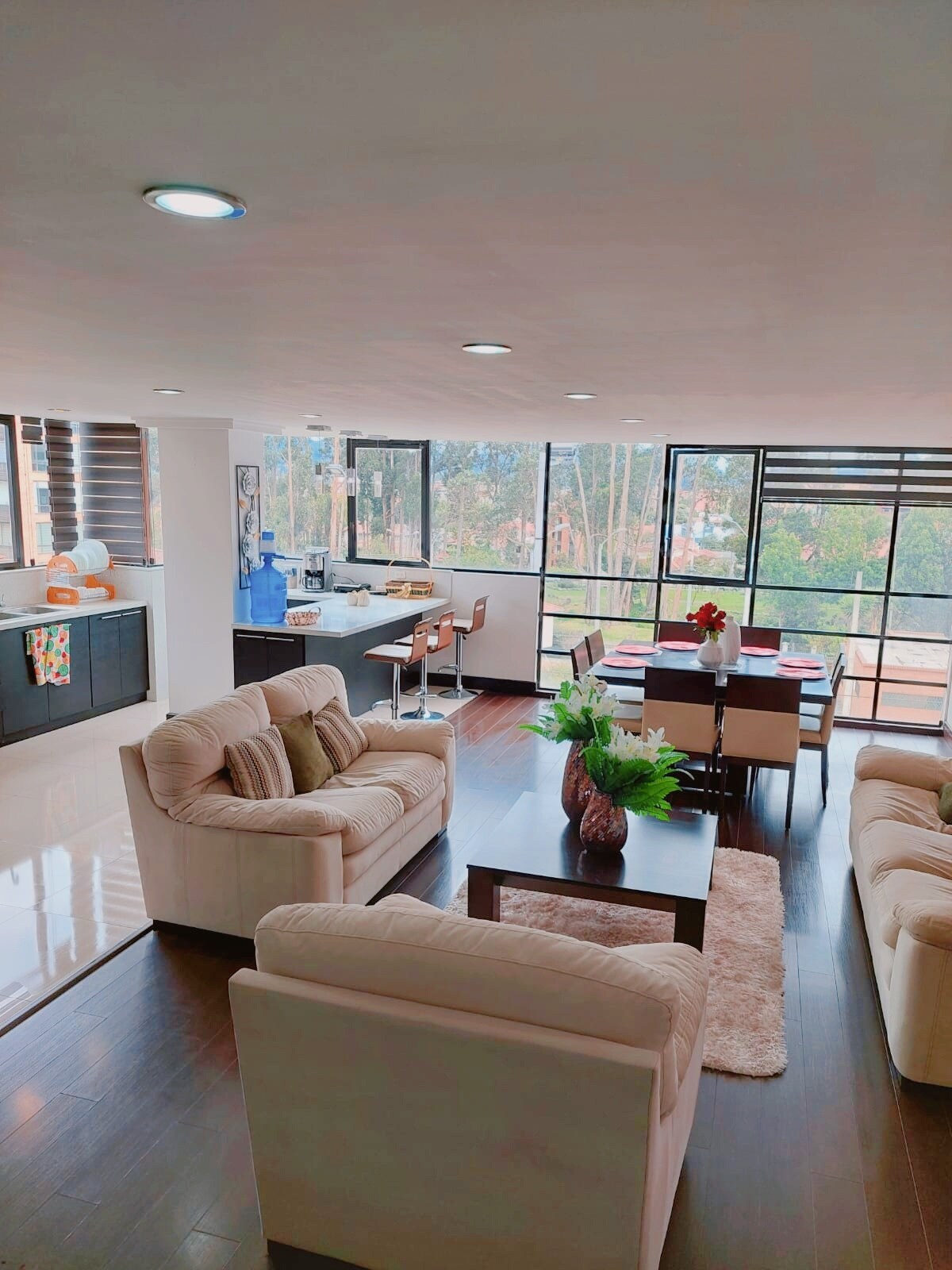 Este elegante alojamiento es ideal para noches de pareja, familia corta o estadías largas de trabajo. Contamos con jacuzzi dentro del departamento, chimenea de bioetanol y una sala con una pantalla de 85” para las mejores noches y experiencias inolvidables de sus vacaciones. Cama tamaño king y hermosos balcones. Cocina propia con todos los implementos necesarios. Cerca de lavanderías, tiendas, restaurantes. Parqueadero propio y cámaras con vista a la calle para su tranquilidad.