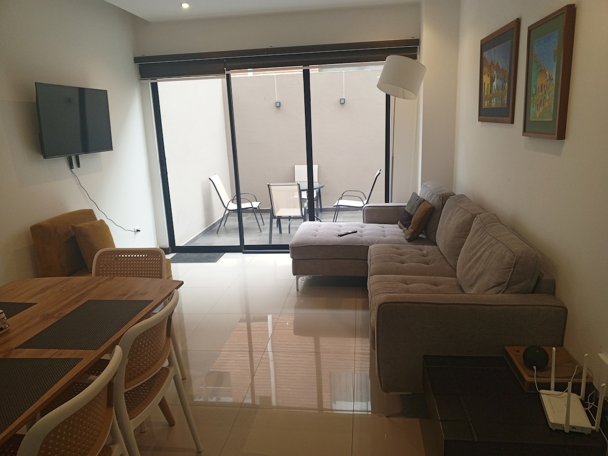 Enjoy this cozy 65 m² suite in a private gated community. It features a bedroom (double + single bed), living room with sofa bed, bathroom, fully equipped kitchen, and WiFi. 🐶 1 pet allowed (up to 20 kg, non-exotic) 🪴 Spacious terrace and garden 🧺 Laundry area 🚗 Free, secure, well-lit parking 📺 Smart TV with Netflix 👶 Baby crib available 📍 Minutes from Cuenca’s historic center, bus station, tram, shops, and restaurants