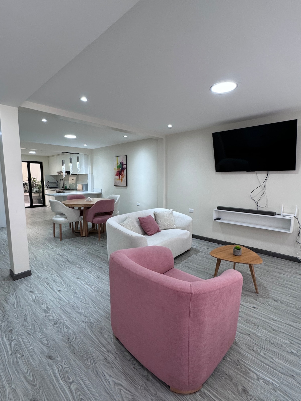 Disfruta de un moderno departamento con sala, comedor y cocina , 1 dormitorio máster con baño privado, 2 dormitorios adicionales y 1 baño completo. Incluye parqueadero privado (acceso con rampa), patio techado con zona de jardín. Ubicado cerca de la orilla del río perfecto para paseos, cerca a restaurantes, tiendas y parques. Además, nos encontramos a 8 minutos del centro de la ciudad. Contamos con una cocina totalmente equipada y con WiFi en las instalaciones.