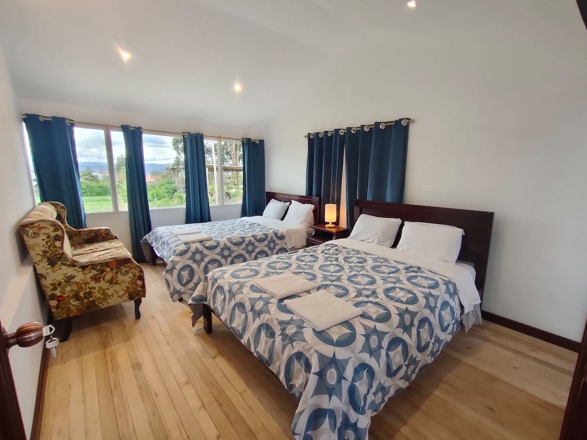 Encantadora casa en un tranquilo y residencial sector de Cuenca. Esta amplia propiedad totalmente amoblada y equipada es ideal por su comodidad para grupos o familias grandes. Cuenta con 4 dormitorios con colchones y almohadas luxury para un descanso de hotel 5 estrellas. Baño privado y clósets amplios en cada uno. Al estar ubicada en una loma cuenta con vista panorámica y la casa aprovecha cada espacio gracias a los amplios ventanales.