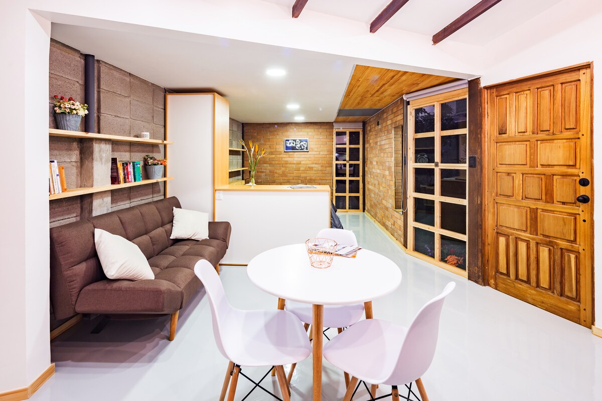 Absorb the warmth and light of open-plan living, with luxurious 9-foot bedroom ceilings, a 20-foot vaulted ceiling with skylight in the common/kitchen area, and oversized windows throughout for a peaceful, quiet, and relaxing stay in Cuenca. ⚡️ 24/7 hot water, Wi-Fi, and electricity for your devices thanks to our grid-tied backup battery system. Note: some high-power appliances like the blow-drier and water kettle do not work during power outages.