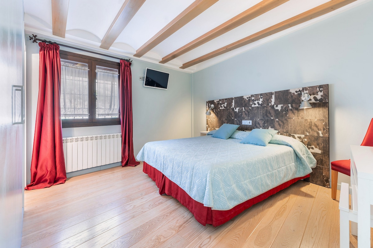 Habitación 3 MORA, en la primera planta, es el rincón perfecto para desconectar en pareja o disfrutar de un viaje en solitario. Su cama doble de 150x190 invita al descanso, en un ambiente acogedor y cuidado al detalle. Cuenta con baño privado con ducha a ras de suelo, decoración que fusiona estilo rural y diseño moderno, y TV de pantalla plana. Un espacio tranquilo, con agradables vistas, pensado para relajarse sin prisas y vivir una estancia especial.