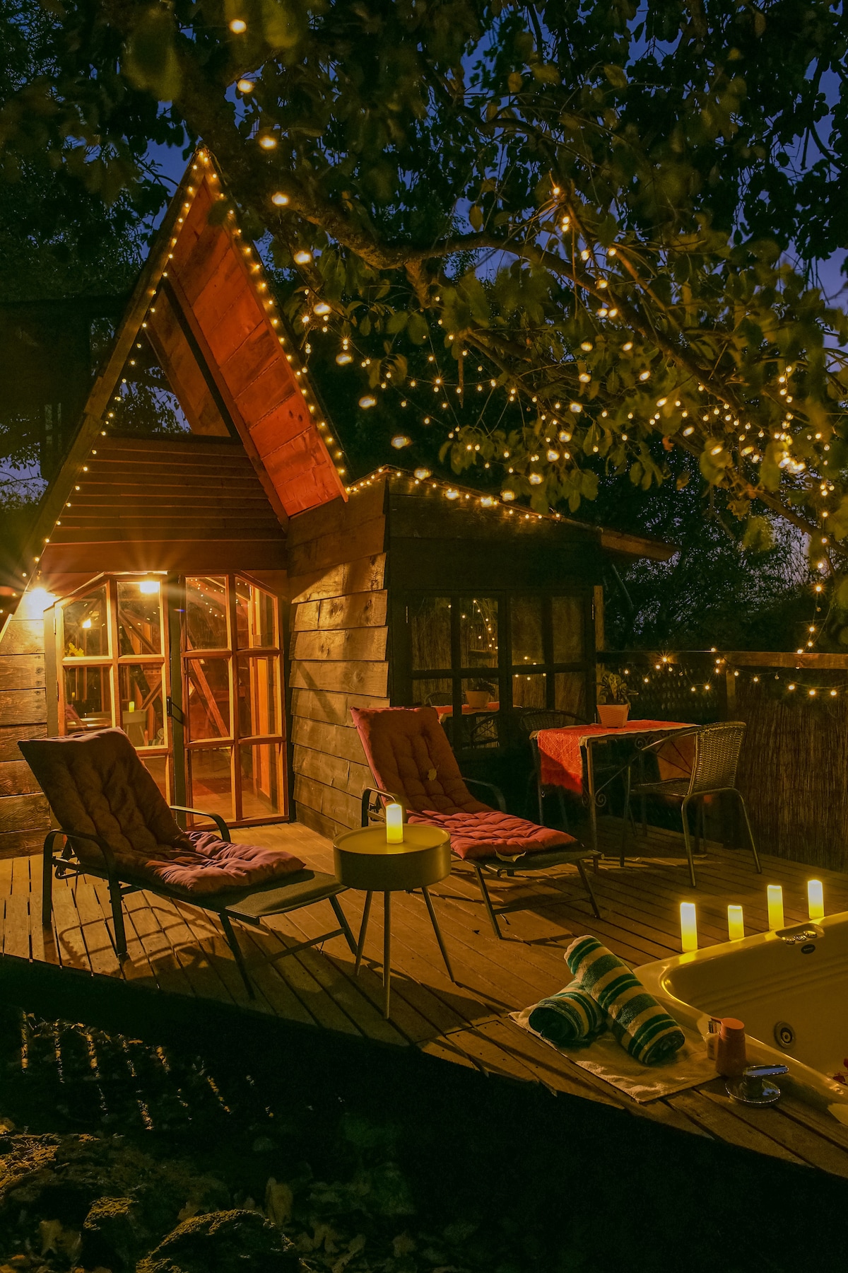 Romántica cabaña de madera con jacuzzi caliente.