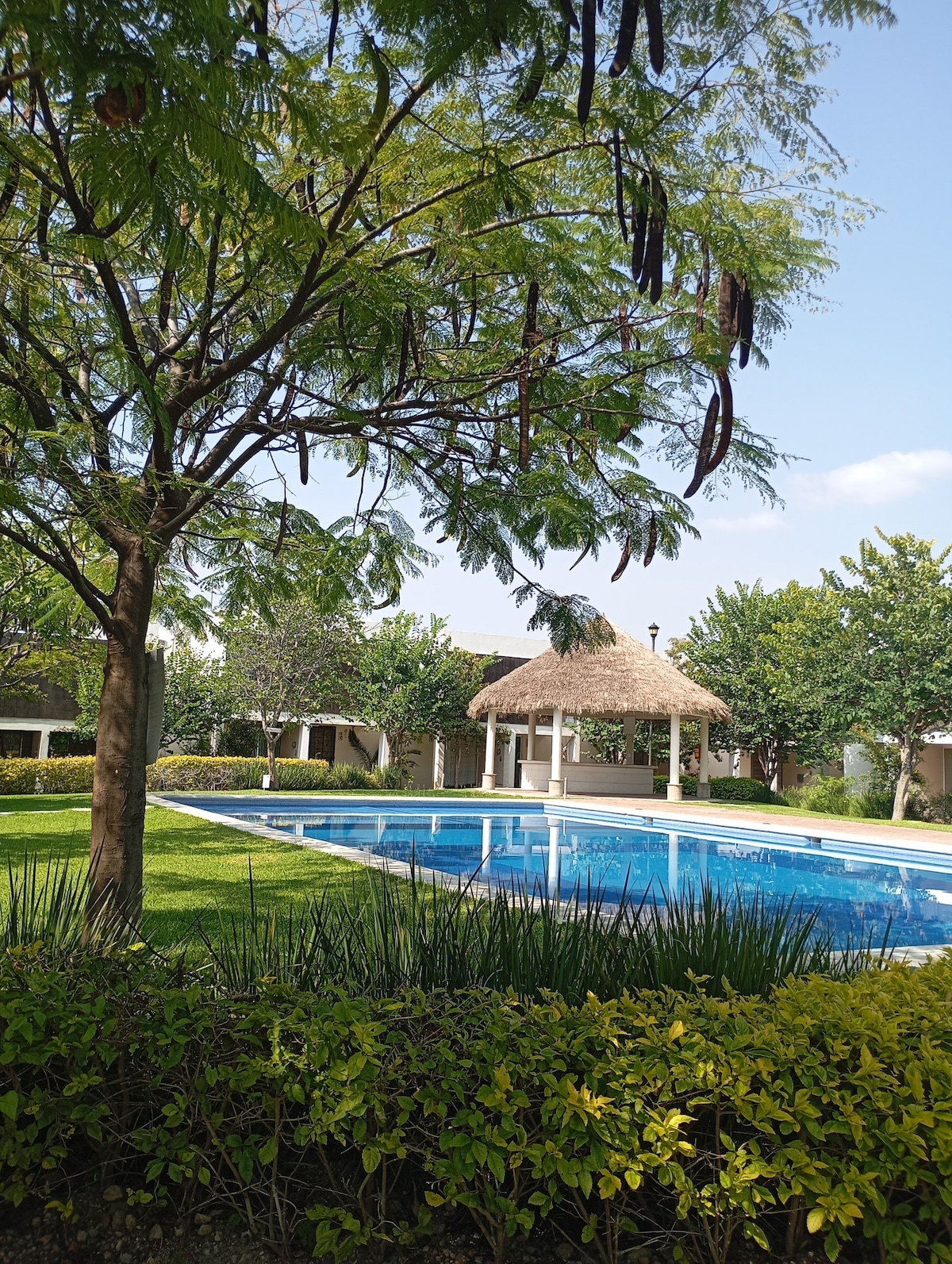 Disfruta de una estancia cómoda y segura en esta acogedora casa en Jiutepec, ideal para familias, parejas o viajeros que buscan relajarse cerca de Cuernavaca. Con alberca, aire acondicionado y cocina equipada, tendrás todo lo necesario para descansar y disfrutar. Situada a pocos minutos de cafeterías, mercados, transporte público y atractivos locales, esta casa es el punto de partida ideal para explorar sin perder la calma. ¡Ven a disfrutar de una estadía cómoda, práctica y llena de encanto!