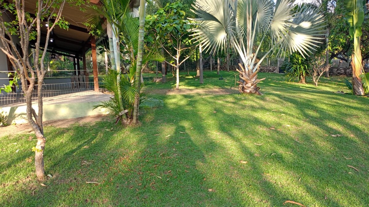 Casa rústica com cozinha aberta em meio a dois pequenos bosques de cerrado. Muita natureza para descanso, totalmente privativo. Area para fogueira. A casa conta com uma suíte grande com cama queen. Banheira de imersão. Quarto anexo à suíte com 3 camas de solteiro. Um lavabo externo. Refeições sob encomenda com parceiros. Parceria tbm com guia de turismo. Estamos a 8 minutos de carro do centro da cidade (praça dos festivais).