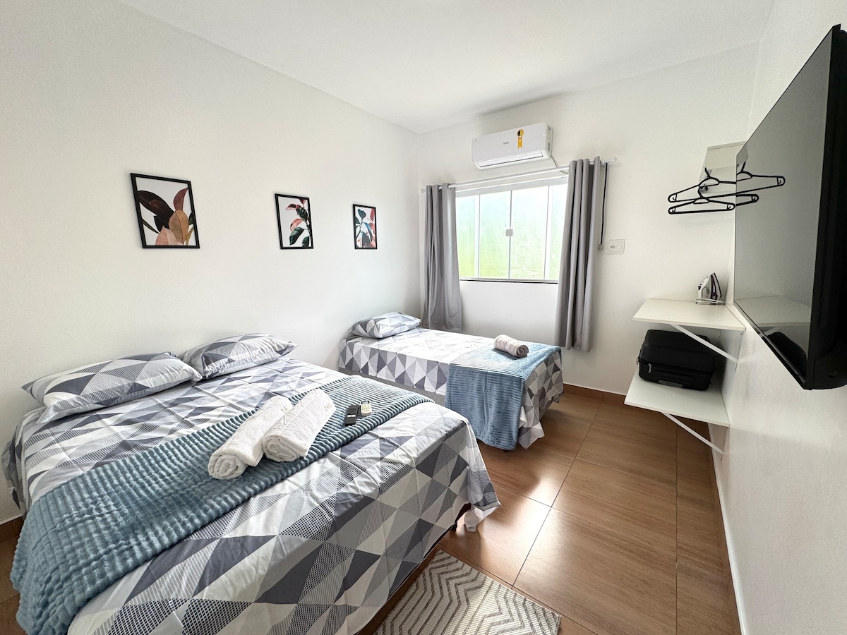 Quarto é super aconchegante, arejado e bate sol da manhã. Está situado em área tranquila e segura. quarto com banheiro. o quintal possui garagens que serão compartilhados com outros hóspedes. tem fácil acesso a tudo! Fica a 2,7 km do aeroporto, no centro de várzea grande e a 10 minutos do centro de cuiabá 1 quarto contendo: 1 cama de casal e 1 cama de solteiro e banheiro tem acesso ao quintal com garagens compartilhadas com outros hóspedes