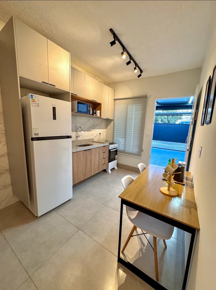 Ambiente simples,todo planejado para estadias rápidas como segurança e conforto de uma casa completa.