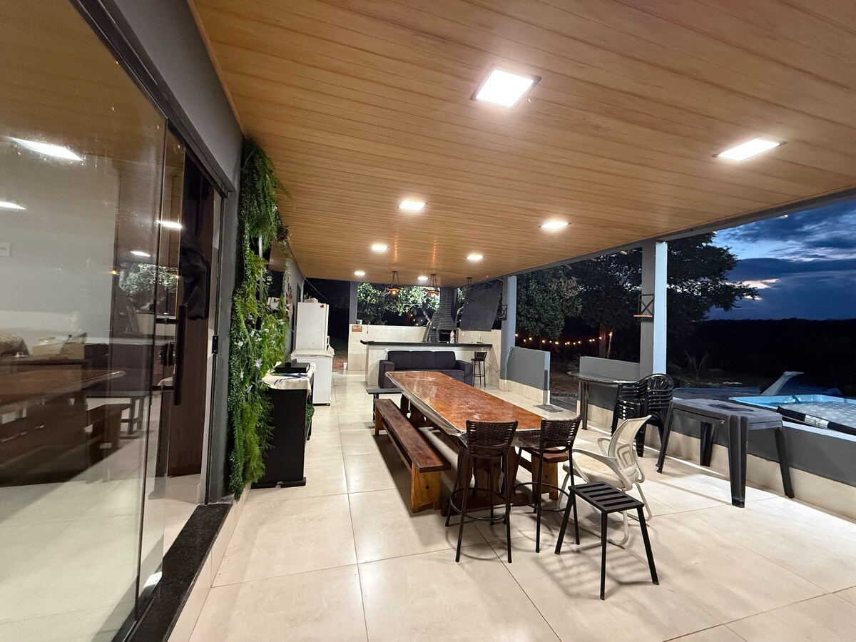 Refúgio na Chapada, perto do centro, para relaxar com conforto e privacidade. • Check-in autônomo, a seu tempo (a partir do horário de entrada) • Garagem privativa • Wi‑Fi rápido • Cozinha equipada para o preparo de suas refeições. • Ar Split 18.000 BTUs: ambiente climatizado em minutos. • Smart TV 43” - Amazon Prime incluso + apps como Netflix, Globoplay - fazendo o login usando a sua conta). • Alexa: peça suas músicas favoritas Obs.: Não possui canais abertos de TV, somente "streaming"