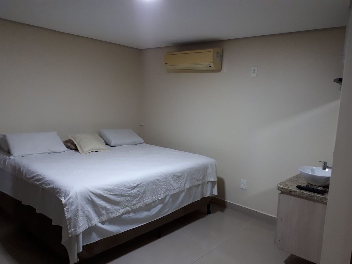 Suíte para 3 pessoas 1 cama QUEEN e 1 de solteiro Casa estilo Refugio Urbano decorada com pecas de artesanato tradicional, bairro nobre, perto de tudo, shopping, restaurantes, perimetrais de acesso, parques e universidade federal. P/ Delivery fornecemos talheres. Pode relaxar na piscina com sua família ate as 10 da noite. Fazer um churrasquinho a beira da piscina e quiosque Um verdadeiro refugio urbano Ótimos preço Prof. universitário aposentado e gosto de receber pessoas. Ambiente tranquilo