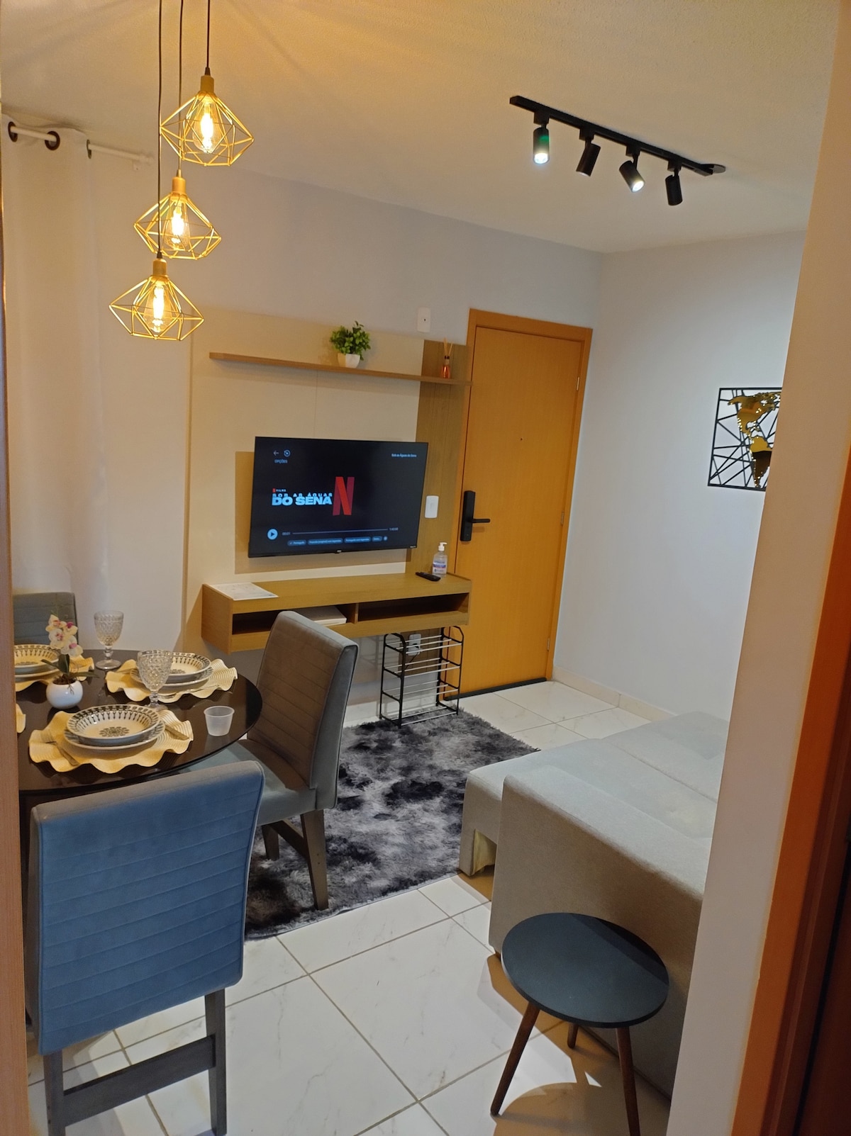 Apartamento muito bem limpo, aconchegante, com uma cama Queen e Ar condicionado Split, Sala com TV Smart, NetFlix e sofá reclinável, WI-FI, cozinha completa com geladeira duplex, fogão, cafeteira, panelas, talheres, sacada com máquina de lavar e torcer roupa, muito seguro, com garagem coberta, tranquilo e a poucos metros de padaria, mercado, açougue, muito bem-localizado, com Piscina e Portaria Eletrônica 24 horas.