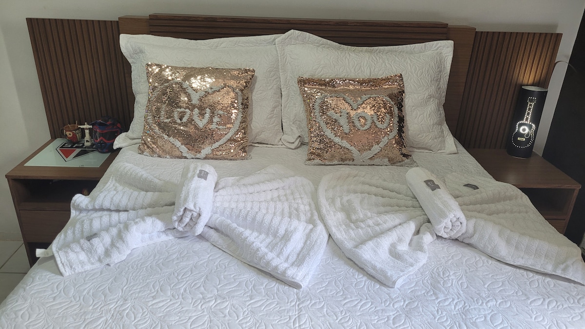 Apartamento com dois quartos, ambos com ar condicionados, ventiladores de teto e dois banheiros, sendo uma suíte. Incluso roupa de cama e banho. *Sala de estar com sofá, tv e ventilador de teto. *Cozinha equipada com fogão, geladeira, microondas, cafeteira, utensílios de cozinha. *Área de serviço com máquina de lavar. *Área de lazer com piscina e quadras de esportes. *Duas vagas de garagem cobertas. *Localizado próximo às principais universidades, mercados, farmácias, shopping, restaurantes...
