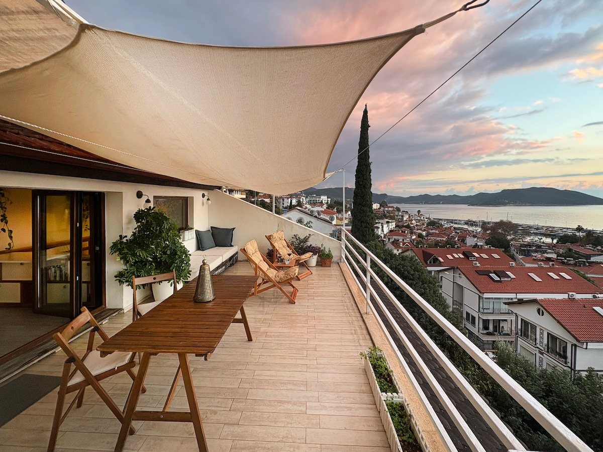 Amazing penthouse in the peaceful center of Kaş, Likya St. The large roof (35m2) is facing up to Kaş Port and Megisti (Kastelorizo) island, backing down to Lycian rock-cut tombs. 80 m2 fully furnished with cedarwood, quality fixtures and fittings.