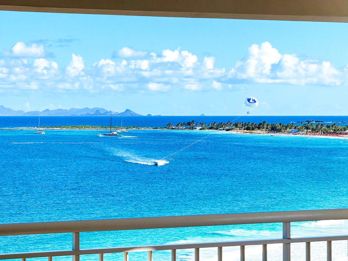 It’s the most beautiful view in all of Orient Bay! A spectacular panorama over the entire Orient Bay beach, St. Barths, Tintamarre Island, and part of Pinel Island. A truly unique experience. The apartment has been completely renovated: 2 separate bedrooms (with no shared walls = perfect privacy for two couples), king-size beds, 2 bathrooms, 2 toilets. A mezzanine with a single bed (90×200). A fully equipped kitchen. Triple exposure = natural ventilation. Direct access to Orient Bay beach.