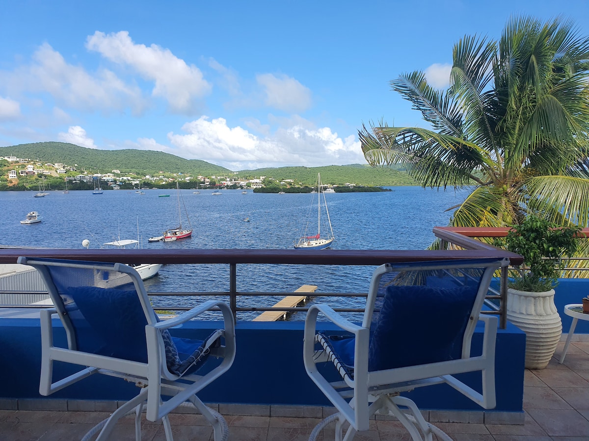 Enjoy easy access from this centrally located, LARGE, 2,200 sf-PH, best spot on Ensenada Bay, Culebra Island, Puerto Rico; in front of public dock, on the water, close to ferry dock, restaurants, shopping, 2 miles from Flamenco Beach. 3 queen bedrms, 2bth, lg terrace. (Not only for a group, sexy for a couple!) Full kitchen, simple, basic, not fancy, sufficient. Good wifi, nice hostess, beach towels, igloo cooler, beach chairs. You will not want to leave the PH! Sunsets, moonrises, happy hour!