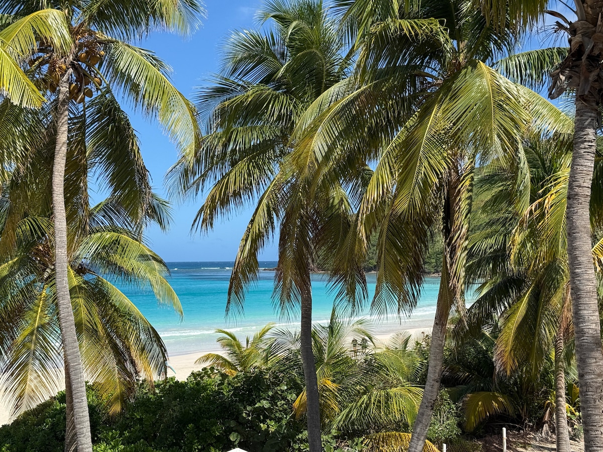 At The Waves is a beautiful beachfront rental villa complex located in Santa Maria Playa, next to the north shore garden district of Bravos de Boston and Isabel Segunda. We have 5 units in total. This unit is the upper 2 bedrooms/2 bathrooms in Casa Las Olas. The master bedroom has a King size bed and an on suite bathroom with a spacious closet. It has a wrap around porch ocean front with views of the island of Culebra and El Yunque on the main island of Puerto Rico.