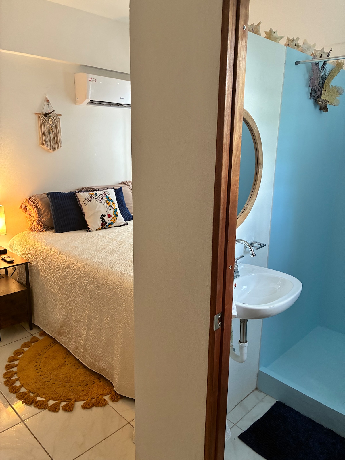 Our recently renovated Penthouse is setup with 2 queen size beds, has a full kitchen combined with living/dining, & a bathroom. The side doors open to a spacious patio. Its only a 7-10 minute walk to the Malecon (the main tourist strip) in Esperanza and is close to the Green Store so you can pick up supplies. We have the fastest wifi that we could get on the island, so guests can stay connected. Tropical gardens on first floor with a mango tree. Brand-new, upgraded Air Conditioner in this unit!