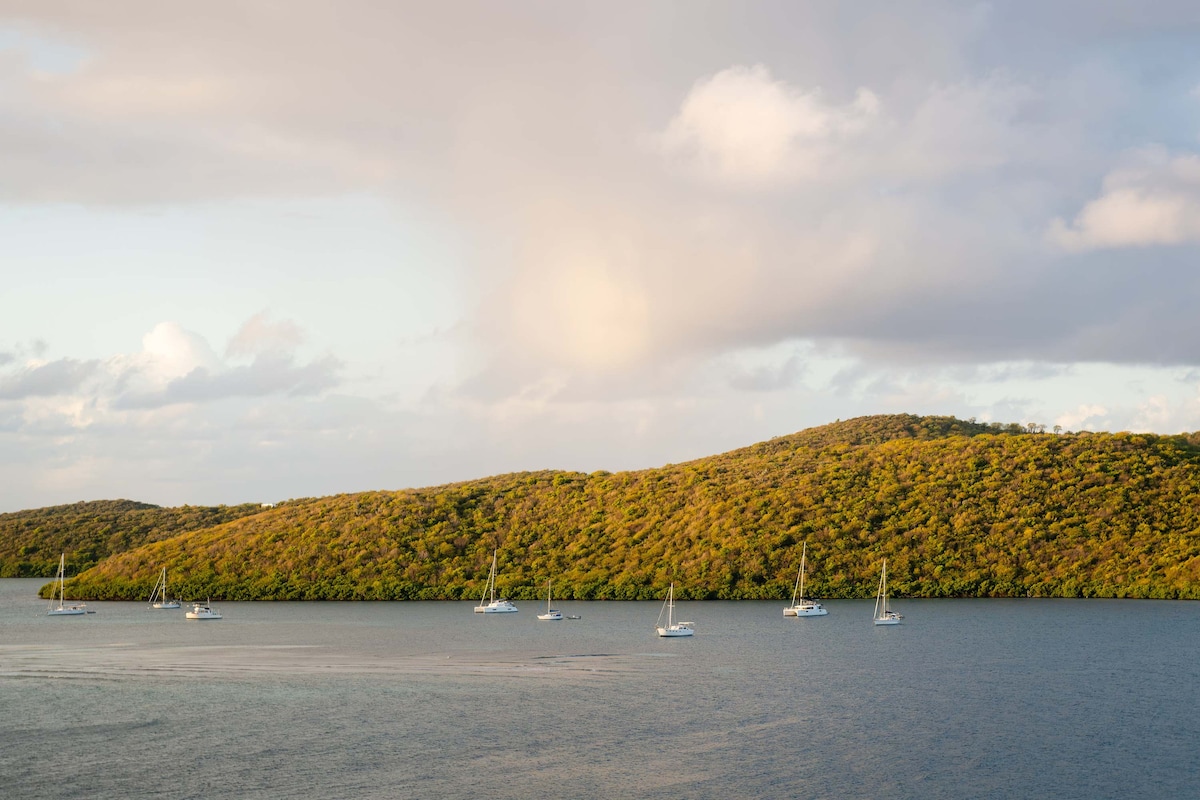 Peaceful hillside duplex with sweeping Caribbean views in Fulladosa Bay. Ideal for couples, creatives, nature lovers, and Culebra returners. Two decks, two bedrooms with AC, and pier for swimming. Upstairs: king bed (bed bridge), full bath, and private deck. Downstairs: queen bed, half bath, full kitchen, and open living room with spacious deck. Quiet setting—secluded yet just a 5-min drive or 25-min scenic walk from town.