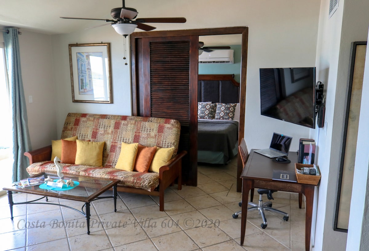 Studio villa with pool and ocean view. Includes: Queen size bed, Full size sofa bed, fully equipped kitchenette, air conditioning, TV (Dish Network), and a balcony with great views of the bay and the pool area. The kitchenette includes stove top, microwave oven, small refrigerator, toaster oven, blender, and all cooking hardware and utensils. Update: Pool is open!