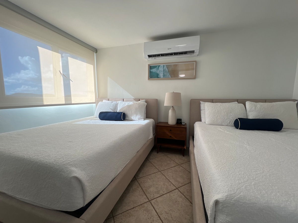 Beautiful and spacious one-bedroom villa with private balcony and access to the complex pool, nestled within the exclusive Costa Bonita complex on the enchanting Culebra Island, home of Flamenco Beach. The villa is equipped with two queen beds, making it suitable for accommodating a maximum of 4 guests. The space features a fully equipped kitchen with a refrigerator, stove, microwave, Nespresso coffee maker, dining table, and 55” Smart TV unit. Villa with two beach chairs and cooler.