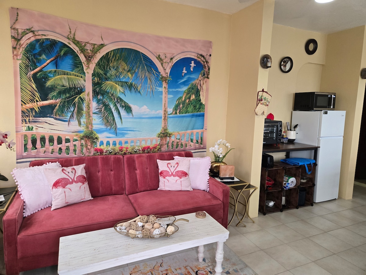 BEDROOM WITH KING SIZE BED, A/C SPLIT UNIT, TV, WiFi. BATHROOM INSIDE BEDROOM. COMPLETE KITCHEN. SMALL LIVING ROOM WITH OCEAN VIEW AND FULL SIZE FOTTON SOFA BED. For additional listings (all in the same location) please type Ocean VIew or run a search under the following titles: -El Encanto de Naturaleza y Romance! Apt 2 -IMPRESIONANTE VISTA AL MAR CARIBE Apt. 4 -Tropical Bongalow on a cliff! Apt. 1