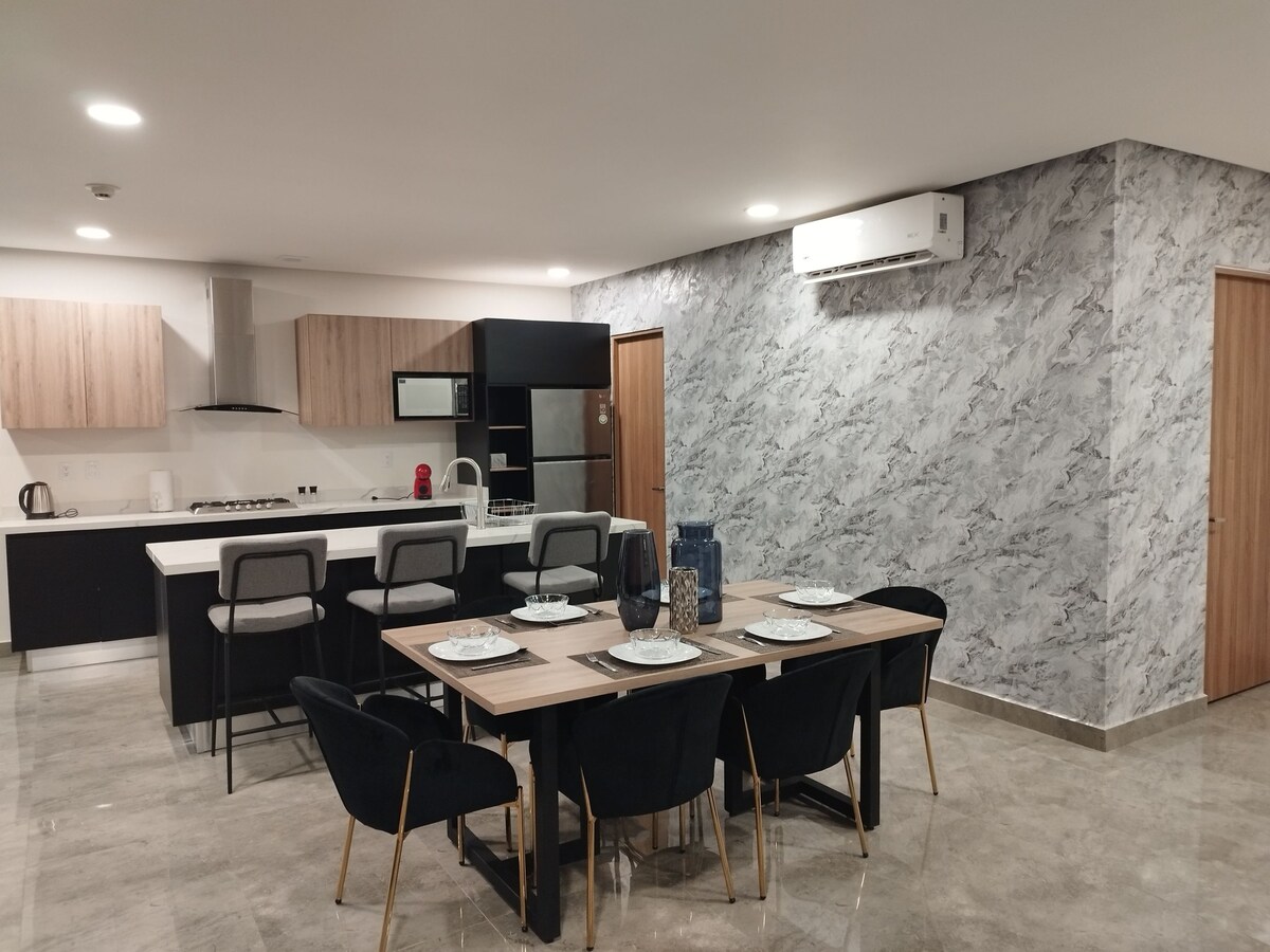 Departamento nuevo en planta baja frente a alberca en excelente ubicación, cerca de Aeropuerto, Hospital Ángeles, Plaza Ceiba y Costco: - Dos recámaras: Principal con cama Queen, secundaria con cama Matrimonial - Cocina equipada - Televisión 4K 55” - Baño completo - Alberca, mesas exteriores y espacio de cowork - Cuarto de servicio con lavadora y secadora Disfruta de una estancia cómoda y conveniente. ¡Te esperamos!