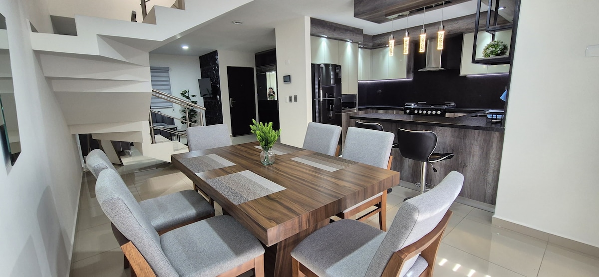 -Zona residencial Las Quintas(de las 5 mejores colonias de culiacan) -Cochera para 2 carros. -Sala Con Tele. -4 cuartos con aire acondicionado(2 con television) con 2 camas King Size y 2 matrimoniales. -Closet en todos los cuartos. -Vestidor grande en recamara principal. A este alojamiento todo le queda cerca, centros comerciales, tiendas de supermercado, etc(a 5 minutos de Forum Culiacan).Hay muy buen servicio de transporte publico.
