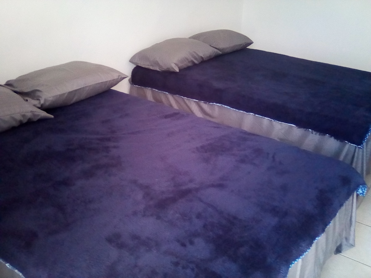 Para tres personas. Con dos camas individuales y un sofá cama. Se encuentra al fondo de la propiedad, colinda con parque de altos árboles. Aunque su baño es chico, está bien equipado hasta para estancias largas..