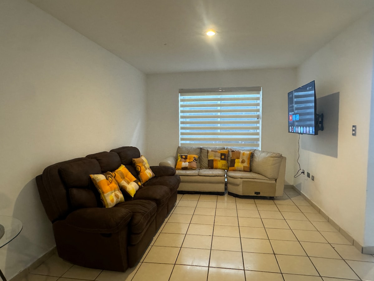 Restaurantes en el área, A/A, WiFi, cocina integral, agua caliente, 2 TV con Sky, 2 plantas, 2 recámaras, 1½ baños, cochera para 2 carros, patio con mesa y bancas. Área dentro de la privada con juegos infantiles y canchas. Acceso controlado, centros comerciales y tiendas de autoservicio a 2 minutos. Conexión a principales avenidas de la ciudad y carreteras, a 10 min del aeropuerto, 10 min del centro de la ciudad y 5 min de La Primavera.
