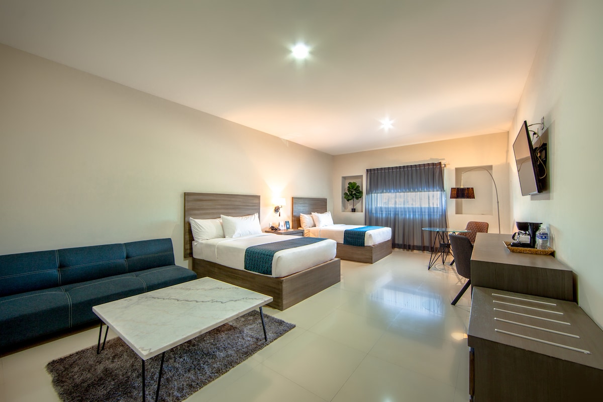 Amplia suite con cocineta, baño privado, sala con sofá cama, escritorio de trabajo y dos camas matrimoniales. El hotel cuenta con restaurante, alberca, estacionamiento privado y servicio de recepción 24 horas.