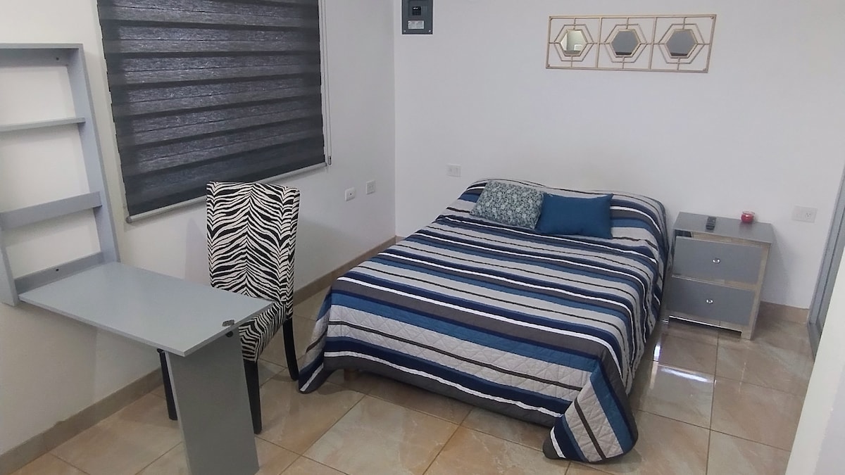 Rest or work in this modern and quiet spot, at street level. Excellent location in residential area in the heart of Las Quintas neighborhood. 5 minutes walking distance to restaurants and other services like laundry, pharmacy, convenience store. 10 minutes driving distance to city downtown.