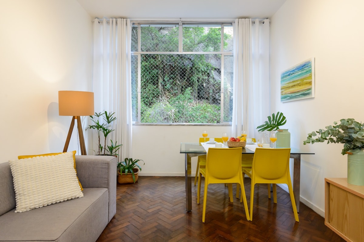 Enjoy a stunning and unique view of both the ocean and the mountain in a centrally located 2 bedroom renovated apartment in Leme, Copacabana ideal for families and couples. The apartment is cozy and has everything you need to make you feel at home. A very spacious and stylishly decorated living room, and a fully equipped apartment. One bedroom has a queen bed, the second bedroom has 2 single beds, and there are 2 more mattress/futons that can be placed in the living room if needed.