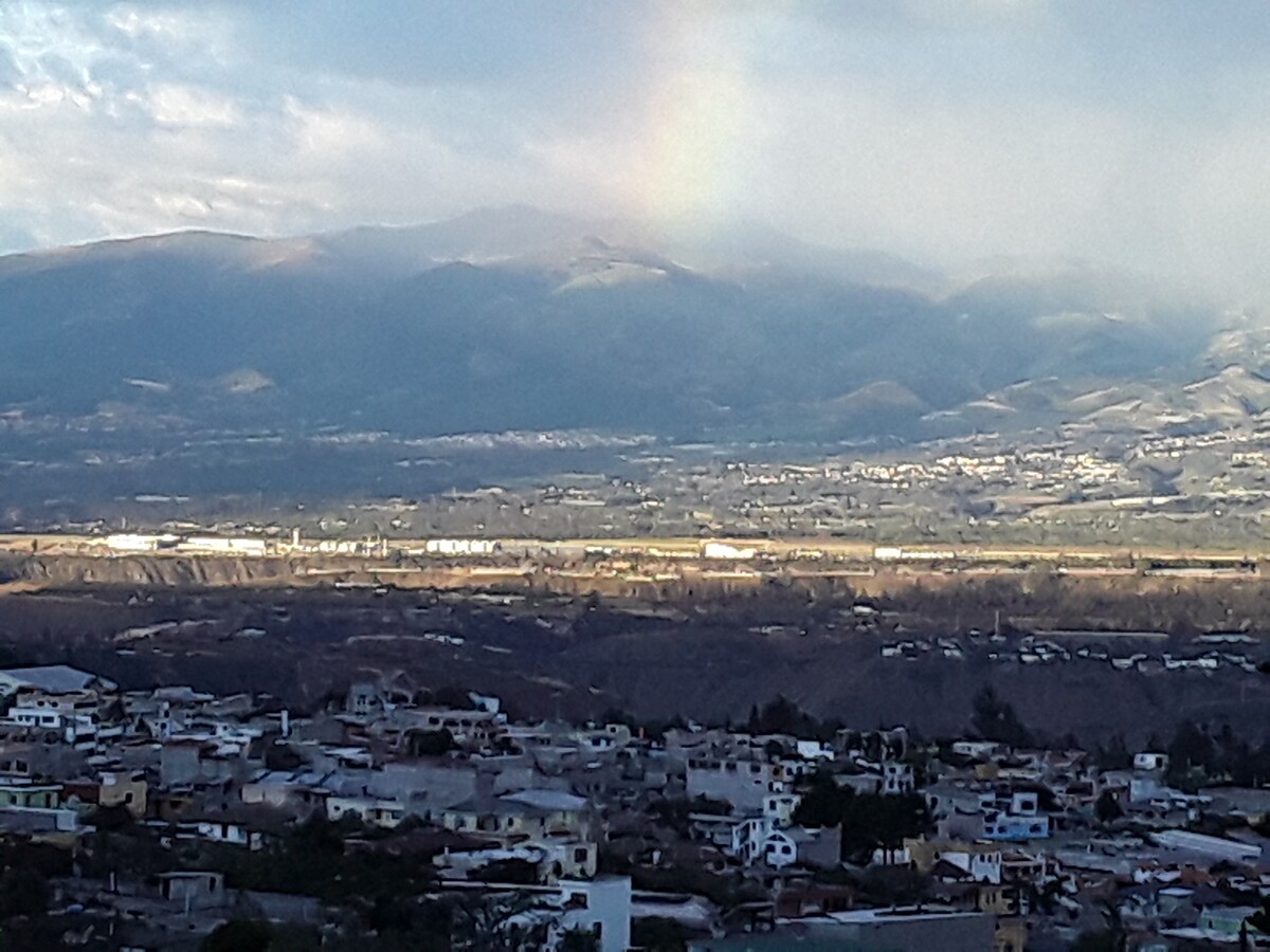 Si desea descansar y alejarse del ruido de la capital, Quito, y a tan solo 10 minutos su mejor opción de hospedaje es mi casa. Cercana a la Universidad de las Américas, al centro corporativo Ekopark, Nayón Valle Extreme, Pista BMX, a los valles de Cumbaya, Puembo, Miravalle; con fácil acceso al transporte público. Casa acogedora con vista a las montañas. Dispone de una cancha de básquet, hamaca, jardín. Balcón para disfrutar de la vista al pueblo. Lugar tranquilo y seguro.