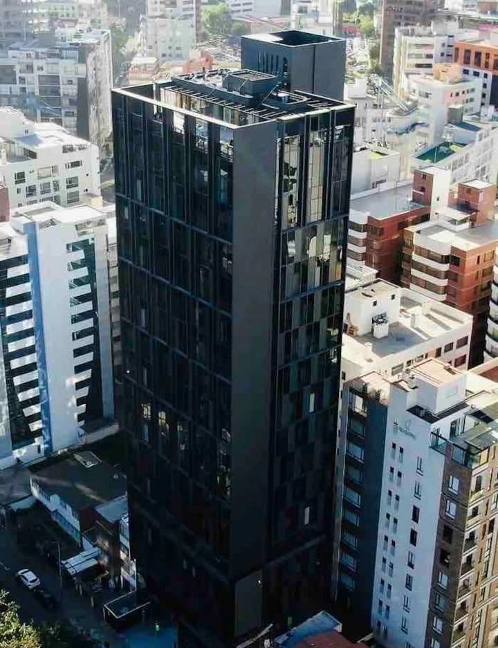 Moderno loft piso 21, edificio nuevo con generador de luz autónomo, ideal para viaje de negocios o para una ocasión especial, vista única de la ciudad. Ubicación privilegiada en el centro norte de Quito junto al parque La Carolina, además a tan solo unos pasos encontrarás centros comerciales e instituciones financieras. El servicio incluye parqueadero, wifi, cine en casa, tina de baño, agua caliente, lavadora/secadora comunal, elementos de higiene, gimnasio y piscina.