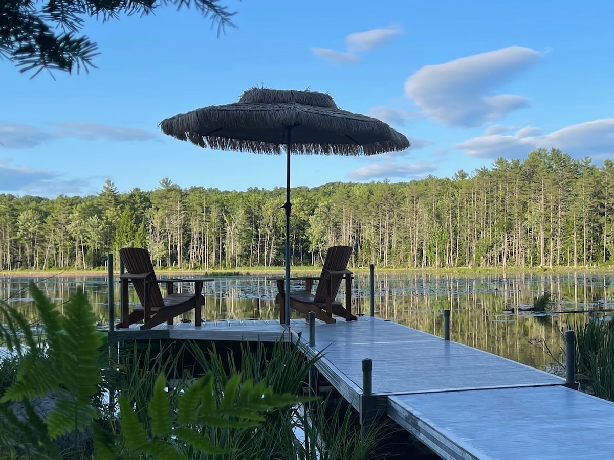 Nestled in the woods and on Adams Pond with new wood fired sauna! The cabin feels totally hidden away but is less than 10 minutes to Bridgton and Naples, hiking, beaches and restaurants. The woods are beautiful and peaceful and the pond is just down a mossy path. Great for couples or a weekend away. Large deck with grill and outdoor shower, firepit. There is a shared dock on the pond for swimming, fishing, or just enjoying the view as well as a canoe and 2 kayaks, and a paddle board.