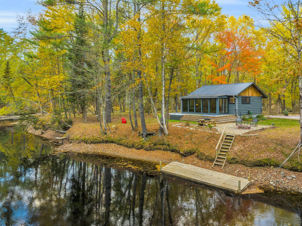 Escape to a luxurious, privately designed glass-walled waterfront cabin on 3+ secluded acres along the Crooked River in Naples, Maine. The river wraps around, offering total privacy, your own sandy beach, dock with direct Sebago Lake access, and state park minutes away. Unwind in the year-round hot tub, outdoor shower, hammocks, or by the see-through fireplace. Luxe bath with heated floors, huge walk-in shower w/ scenic window. AC, pets welcome. Perfect peaceful retreat—come recharge!