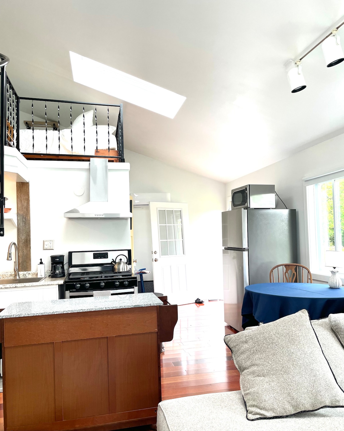 Relax with your family in this modern studio apartment. Kids or adventurous adults will love climbing into the twin bed nook to read a book or sleep. Have a seat at the table to play a board game, eat a home cooked meal, or devour takeout. Lay in the king bed or sit on the couch to watch a movie or just relax. We are in a private wooded area just 5 minutes from downtown Freeport.