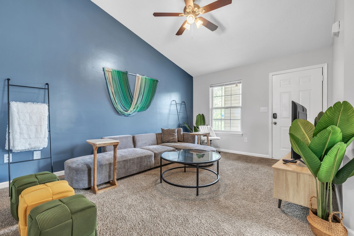 Welcome to The Golden Mantel, a scenic 3BR/2.5BA retreat in Fayetteville. Sleeps 8 with a king suite, queen, and two fulls. Relax in the elegant living room with a 70" smart TV, or cook in the open kitchen with a chef’s island. The scenic deck overlooks wooded views, with a fire pit patio below. Bedrooms include a muraled king suite, a butterfly-themed room, and a golden queen. The spacious garage doubles as a gym and game room. Comfort, style, and connection come together in every stay.