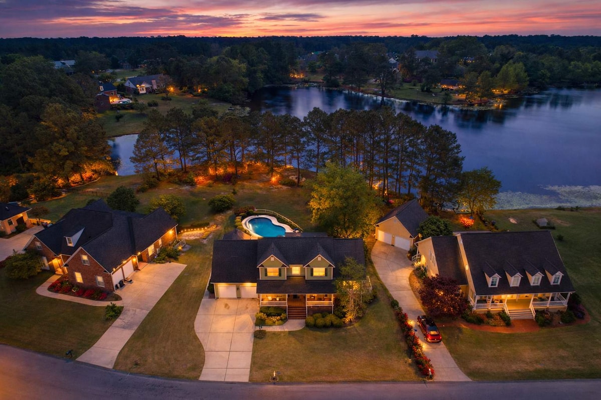 Guest Favorites: Waterfront fire pit w/ Adirondack chairs & grill Private pool & loungers Kayaks + life jackets Full kitchen: 3 ovens, 2 fridges, coffee bar 9-ft Tournament Billiards Table Arcade 10-ft Custom Slab Bar & 75" Smart TV Workout space Seating for 20 guests across 3 dining areas Ceiling fans in all bedrooms TVs in king rooms Kid & family extras: popcorn machine, games, library, pack & play 5 bedrooms + sleeper sofa 1 mi to Cypress Lakes Golf Course, 50min to Pinehurst