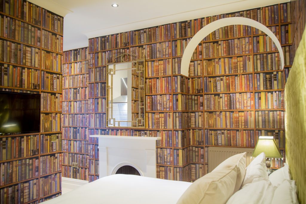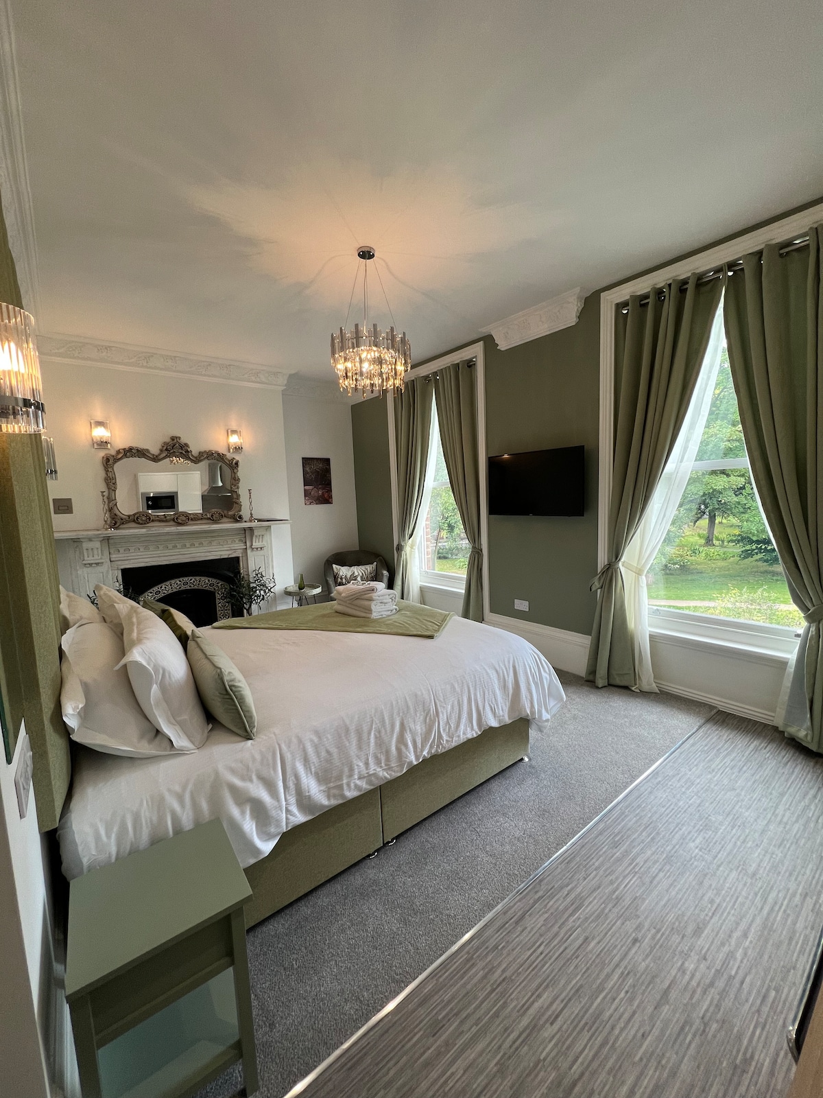 THE LIBRARY. A SPACE TO TRULY RELAX IN OPULENCE. A mixture of dark green colours and the velvet headboard truly make this a space you can enjoy to wind down at the end of the day or work away in peace and quiet.