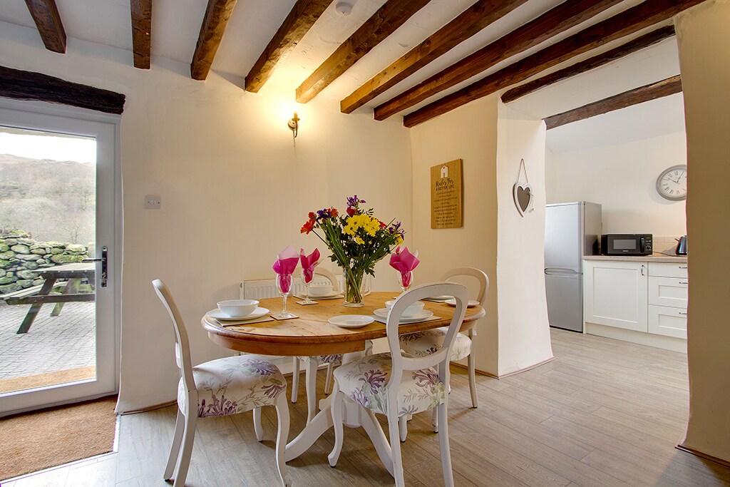 The perfect romantic retreat, Swallows Rest, is a converted 18th century hay barn. Belonging to the 17th century Grade II listed High Greenrigg House, it offers all the modern conveniences whilst retaining the character of such an historic building. The ground floor contains an open plan living room, dining area and fully fitted kitchen. There is a utility room accessed via a low stone doorframe. Upstairs is a mezzanine floor with king size bed, balcony and luxurious shower room