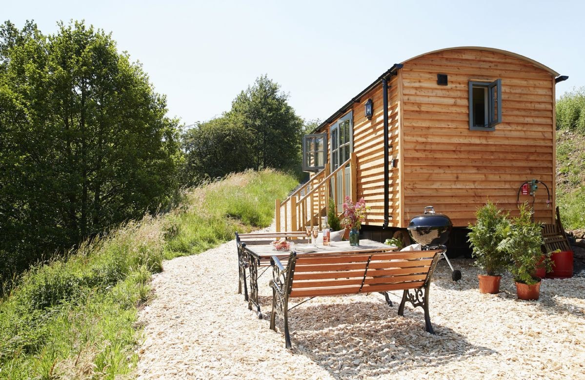 The Orchard is our luxurious custom built Shepherd's Hut for two, set on a working farm surrounded by idyllic nature. Enjoy amazing views of the surrounding rolling countryside, a perfect tranquil location. Appointed to a high standard with underfloor heating, the sizeable open plan living space has a bespoke fitted kitchen, oven, hob, dining table, smart TV and double bed. Ensuite bathroom with luxurious shower. Large outdoor seating area with combi firepit/BBQ swing arm for you to relax.