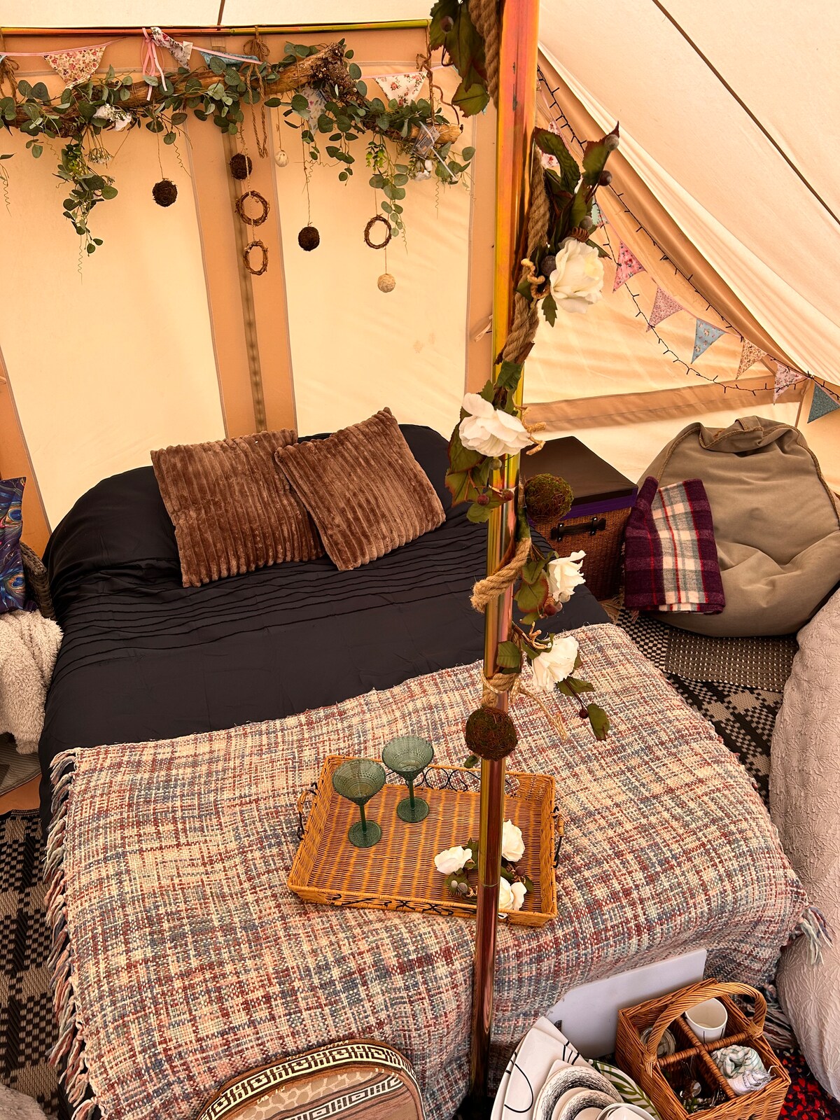 Beautiful Stunning Glamping. I run the site single handedly and work very hard to ensure you have a wonderful stay. The bell tents have been carefully designed With real beds, air dried cotton sheets and elegant decor. The tent sleeps up to 4. One ‘real’ double and two air beds with quilts and linen provided. Set in the heart of the countryside in the quaint village of Norland, the site is wonderfully, peaceful, fully equipped you only need your towel and overnight bag!!