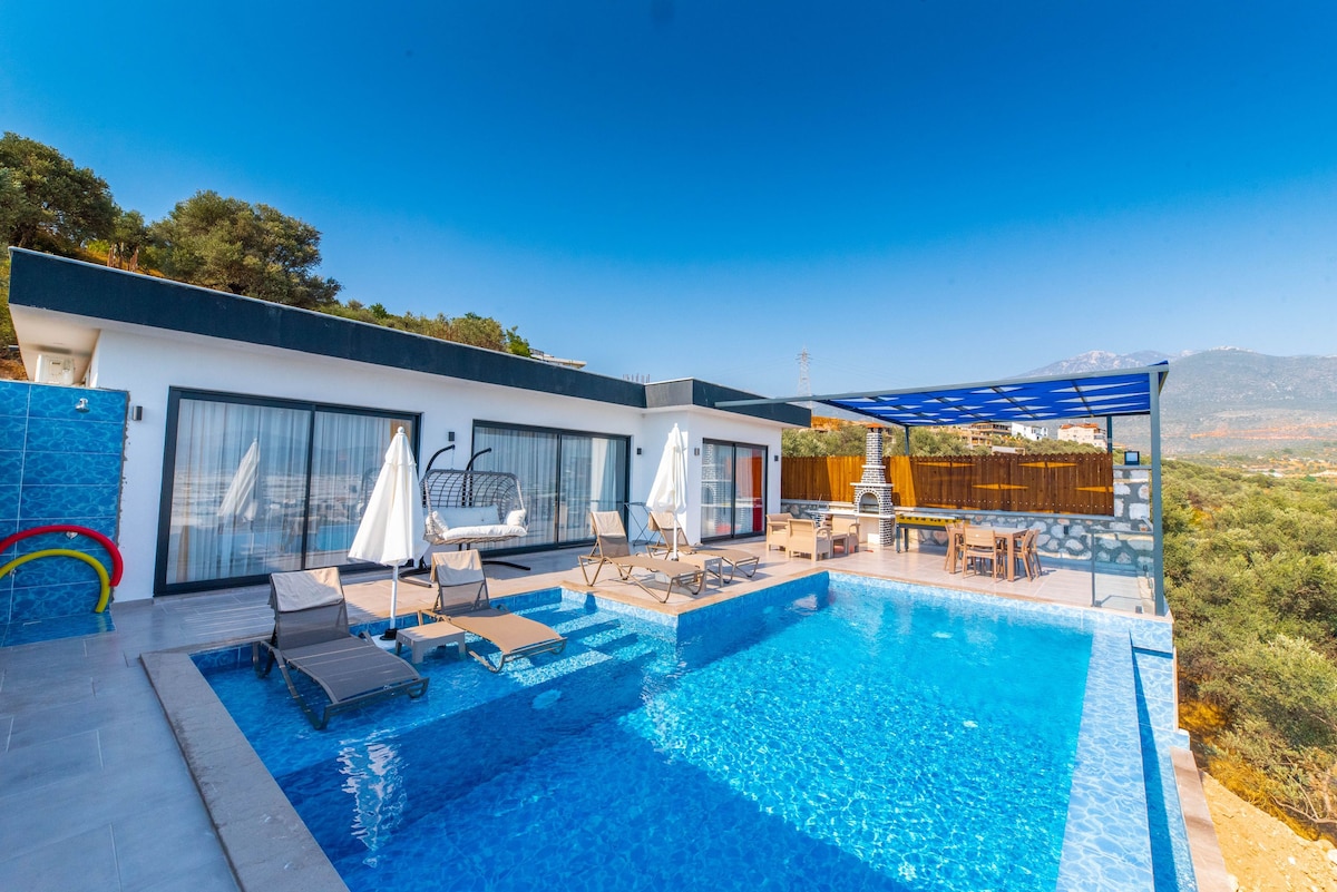 This stunning 4 bed/4 bath villa offers breathtaking views from every corner and only 5 minutes walking distance from the beach . Recognized with the 2024 top design award by the Turkish Architecture Board, it features generously sized pool, panoramic windows, luxury marble bathrooms, sauna, gym and several terraces. Located in a Kisla, a high-in-demand upscale area in Kalkan, provides a peaceful and relaxing environment.